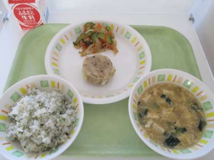 今日の給食は、じゃこと青のりのごはん、ジャンボしゅうまい、こんにゃくサラダ、中華風コーンスープ、牛乳です。