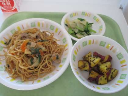 今日の給食は、塩やきそば、かぶのレモンしょうゆがけ、大学いも、牛乳です。