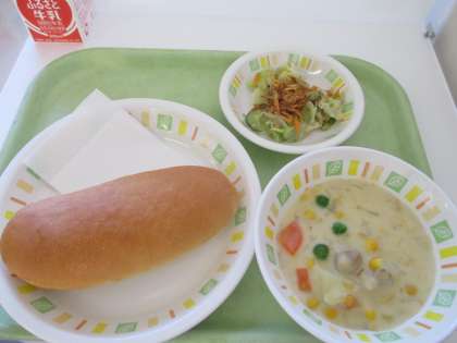 今日の給食は、りんごジャムサンド、コーンシチュー、ごぼうチップサラダ、牛乳です。