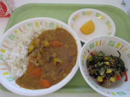 今日の給食は、秋野菜カレーライス、大根とひじきのサラダ、かき、牛乳です。