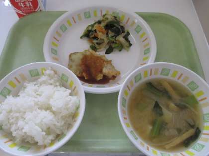 今日の給食は、ごはん、真鱈のステーキソースがけ、わかめサラダ、みそ汁、牛乳です。