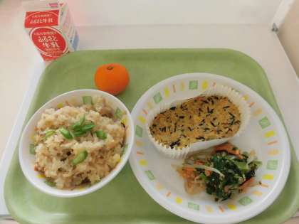 今日の給食は、きのこごはん、擬製豆腐、野菜のごまだれかけ、みかん、牛乳です。