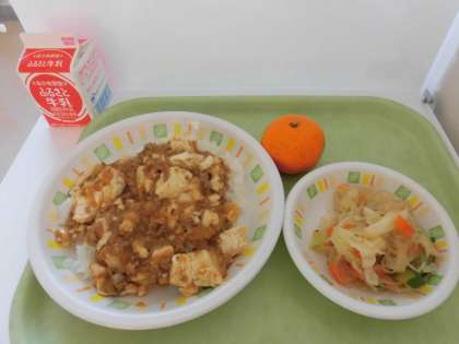 今日の給食は、麻婆豆腐丼、春雨サラダ、みかん、牛乳です。
