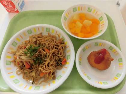 今日の給食は、ソース焼きそば、ポテトドック、フルーツポンチ、牛乳です。