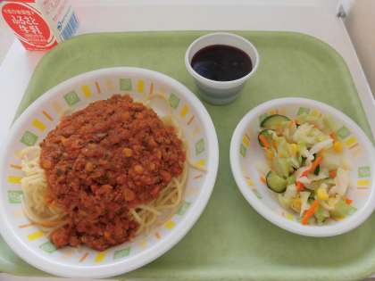 今日の給食は、スパゲティーミートソース、コールスローサラダ、ぶどうゼリー、牛乳です。