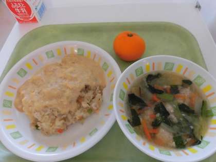 今日の給食は、卵あんかけチャーハン、肉団子入り春雨スープ、みかん、牛乳です。