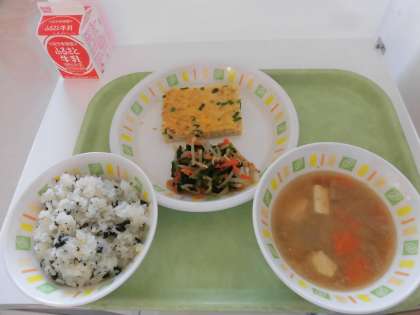 今日の給食は、わかめごはん、切干大根入り卵焼き、野菜のおひたし、すりごま入りみそ汁、牛乳です。
