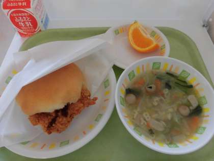 今日の給食は、チキンカツバーガー、ABCスープ、いよかん、牛乳です。