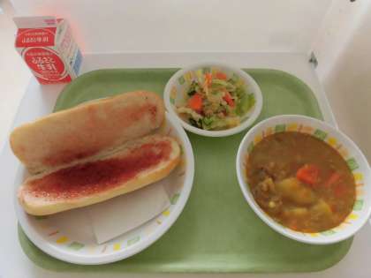 今日の給食は、イチゴジャムサンド、カレーシチュー、ツナサラダ、牛乳です。