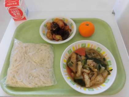 今日の給食は、けんちんソフト麺、くじら肉とじゃがいもの揚げ煮、みかん、牛乳です。今週は学校給食週間のため、昔の献立を取り入れました。