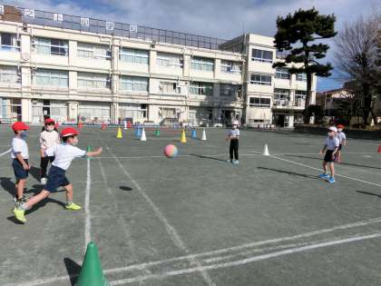 と元気な声。1年生のドッジボールの試合のあいさつです。
