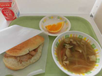 今日の給食は、照り焼きチキンバーガー、白いんげんの田舎風スープ、ネーブル、牛乳です。