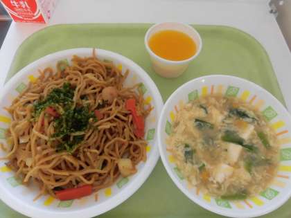 今日の給食は、海鮮オイスターソース焼きそば、中華風コーンスープ、つぶつぶみかんゼリー、牛乳です。