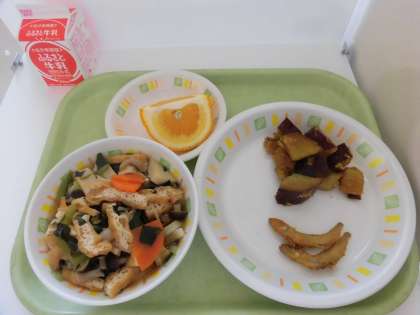 今日の給食は、煮込みうどん、わかさぎのカレー揚げ、さつま芋の甘辛煮、甘夏、牛乳です。献立表のくだものは、はるみの予定でしたが、甘夏に変更しております。