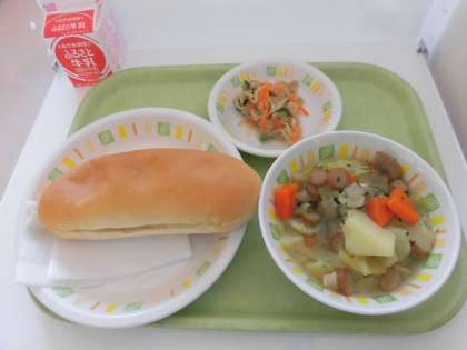 今日の給食は、ミルククリームサンド、もやしとツナのサラダ、ポトフ、牛乳です。