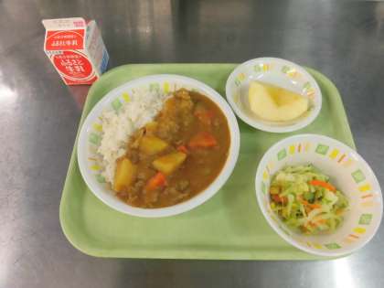 2月22日(月)の給食は、カレーライス、コールスローサラダ、りんご、牛乳です。