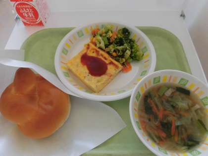 今日の給食は、ミルクパン、スペイン風オムレツ、ブロッコリーのサラダ、ベーコン入り野菜スープ、牛乳です。