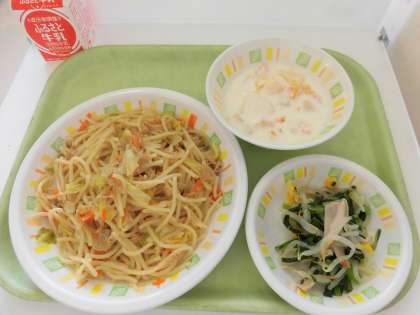 今日の給食は、キャベツとツナのスパゲティ、青菜のサラダ、フルーツヨーグルト、牛乳です。