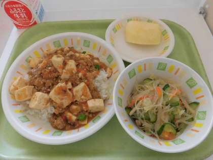 今日の給食は、麻婆豆腐丼、春雨サラダ、りんご、牛乳です。