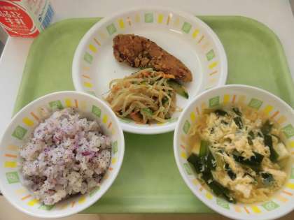 今日の給食は、ゆかりごはん、かつおのたつたあげ、もやしのごま酢あえ、にらたまみそ汁、牛乳です。