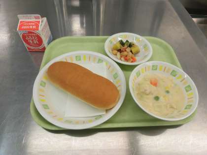 3月10日(水)の給食は、イチゴジャムコッペサンド、コーンシチュー、ビーンズサラダ、牛乳です。献立表にはさつまいもは記載しておりませんが、サラダに使用しました。