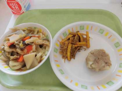 今日の給食は、けんちんうどん、ジャンボしゅうまい、かえりきんぴら、牛乳です。