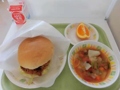 今日の給食は、ヒレカツバーガー、ミネストローネ、清見オレンジ、牛乳です。