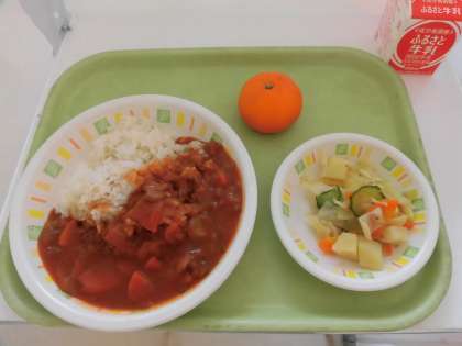 今日の給食は、ハッシュドビーフライス、ポテト入りフレンチサラダ、みかん、牛乳です。6年生はお楽しみ給食でした。飲み物は3種類から事前にセレクトし、フライドポテトとからあげ、ミニチーズケーキ、いちごがつきました。