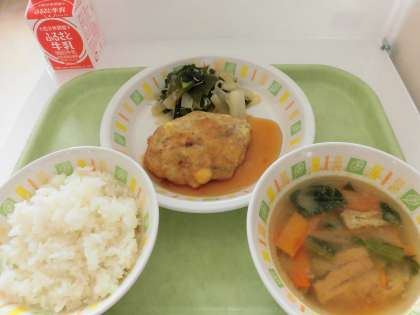 今日の給食は、ごはん、豆腐入りさくさくつくね、じゃこサラダ、すりごま入りみそ汁、牛乳です。