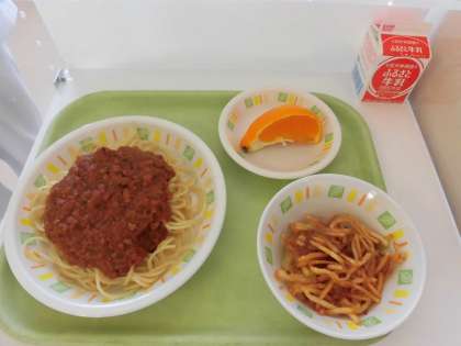 今日の給食は、スパゲティミートソース、じゃがいものハニーサラダ、でこぽん、牛乳です。今日は、今年度最初の給食です。美味しく、安心、安全な給食を作っていきますので、どうぞよろしくお願いいたします。
