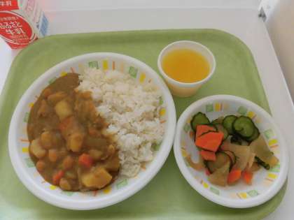 今日の給食は、チキンカレーライス、シャキシャキ野菜、みかんゼリー、牛乳です。