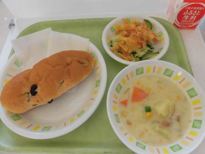今日の給食は、ぶどうパン、コーンシチュー、パリパリサラダ、牛乳です。