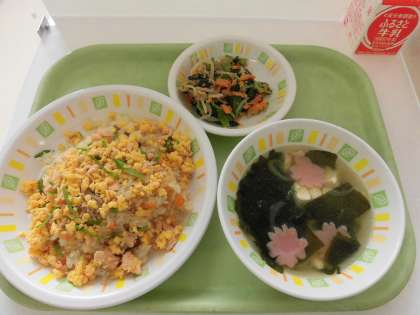 今日の給食は、鮭ちらし、野菜のごま和え、春の祝い汁、牛乳です。入学、進級お祝いメニューです。