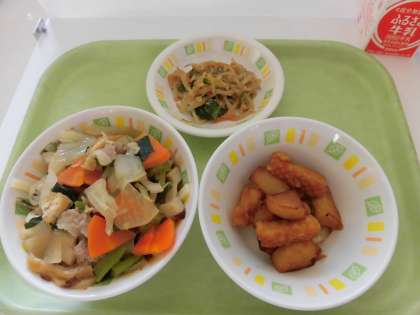 今日の給食は、ちゃんこうどん、いかとじゃがいもの揚げ煮、もやしのごま酢あえです。