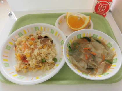 今日の給食は、チャーハン、ワンタンスープ、甘夏、牛乳です。