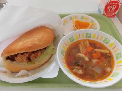 今日の給食は、セルフフィッシュサンド、ミネストローネ、清見オレンジ、牛乳です。