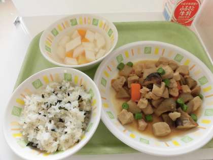 今日の給食は、わかめとじゃこのごはん、いりどり煮、杏仁豆腐、牛乳です。