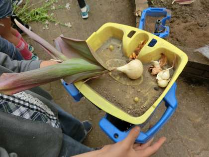 土の中にできた球根を取り出す作業をしていました。