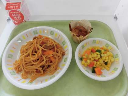 今日の給食は、スパゲティナポリタン、トロピカルサラダ、りんごマフィン、牛乳です。