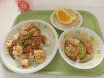 今日の給食は、麻婆豆腐丼、春雨サラダ、美生柑(みしょうかん)、牛乳です。