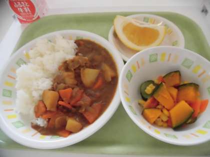 今日の給食は、カレーライス、パンプキンサラダ、宇和ゴールド、牛乳です。