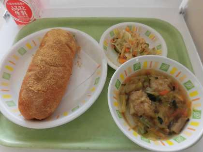 今日の給食は、きな粉あげパン、肉団子入り春雨スープ、ごぼうチップサラダ、牛乳です。
