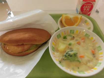 今日の給食は、照り焼きチキンバーガー、クラムチャウダー、甘夏、牛乳です。今日のパンは、明日葉の粉末が入った明日葉パンのため、少し緑色をしています。