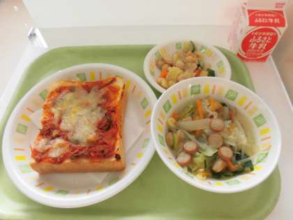 今日の給食は、ツナピザトースト、マカロニスープ、ビーンズサラダ、牛乳です。