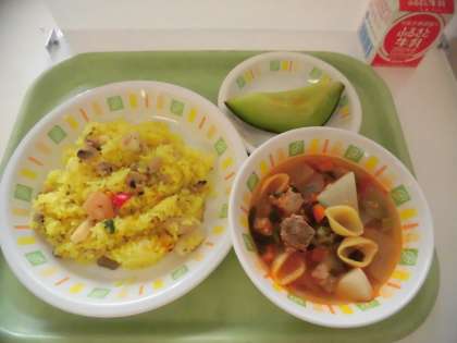 今日の給食は、パエリア、ミネストローネ、メロン、牛乳です。