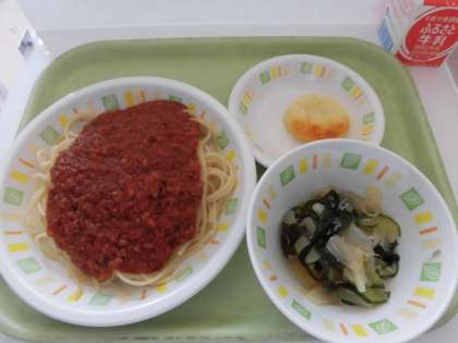 今日の給食は、スパゲティーミートソース、ポンデケージョ、じゃこサラダ、牛乳です。