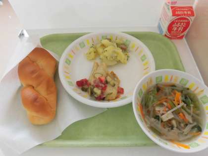 今日の給食は、ミルクパン、メルルーサのエスカベージュ、ジャーマンポテト、ベーコンともやしのスープ、牛乳です。