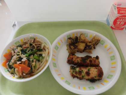 今日の給食は、五目冷しうどん、ちくわの磯部揚げ、さつま芋の甘辛煮、牛乳です。