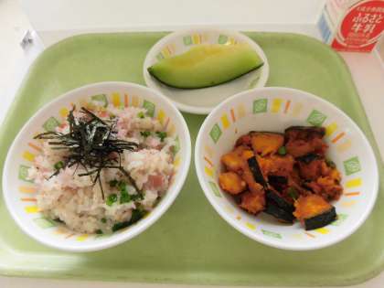 今日の給食は、梅茶漬け、いかとかぼちゃの揚げ煮、メロン、牛乳です。