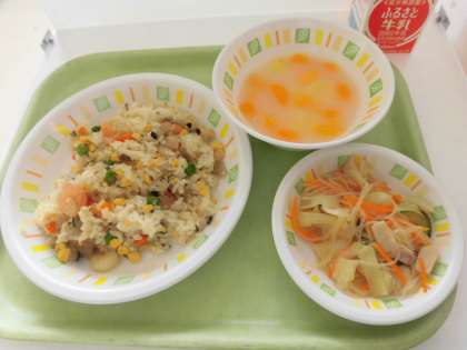 今日の給食は、チャーハン、春雨サラダ、ホワイトポンチ、牛乳です。ホワイトポンチは、カルピスでシロップを作りました。